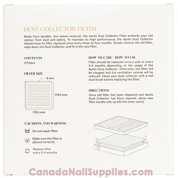 Keep your Apres Dust Collector 2 running at its optimal capacity with our Dust Collector Filters. Made from durable, non-woven material, the Apres Dust Collector Filter protects your nail station from dust and debris. To maintain its high performance, the Apres Dust Collector should have its filter replaced once a year. Simply remove the old filter, wipe down the Dust Collector, and fit in the new filter.