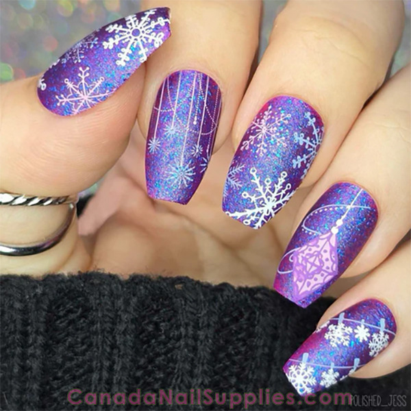 Add a touch of winter elegance to your nail art with this delicate stamping plate! Featuring beautifully detailed snowflakes suspended on dainty chains, festive baubles, and graceful hanging accents, this design brings a sense of sparkle and sophistication to your holiday looks. Perfect for creating everything from frosty minimalism to full-on festive glam - let your nails shimmer like falling snow!