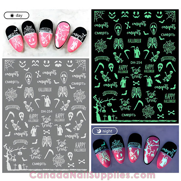 Illuminate your Halloween spirit with our Glow-in-the-Dark Halloween Nail Stickers! This large sheet (8cm x 10.5cm) is packed with spine-tingling designs including mischievous skeletons, playful pumpkin faces, intricate spider webs, eerie reapers, and a chilling haunted tree grave scene. Perfect for adding a mystical glow to your nails, these stickers will make you the center of attention as the sun sets. Whether you're heading to a Halloween party or just want to add some spooky fun to your everyday look, these glowing stickers are sure to cast a spell of delight and fright!