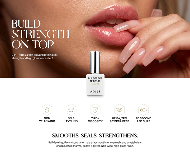 Aprés Builder Top Gelcoat is a true 2-in-1 essential, delivering instant builder-level strength and a high-gloss, non-wipe shine in just one coat. Designed to smooth uneven surfaces, reinforce nail art, and seal in embellishments, this multitasking gelcoat eliminates extra steps without sacrificing durability or clarity.