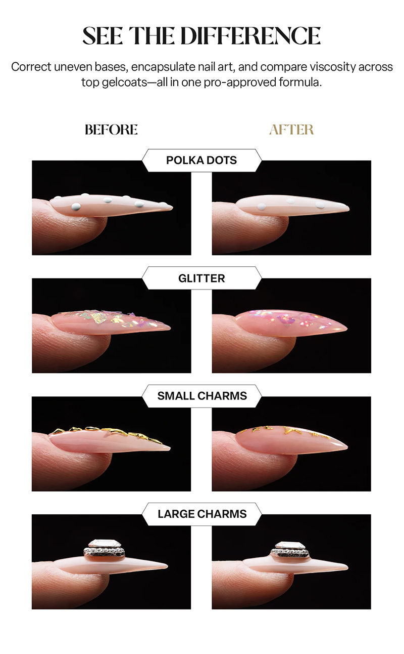 The self-leveling formula glides on effortlessly, locking in art and texture while extending the life of every set with a flawless, glassy finish.